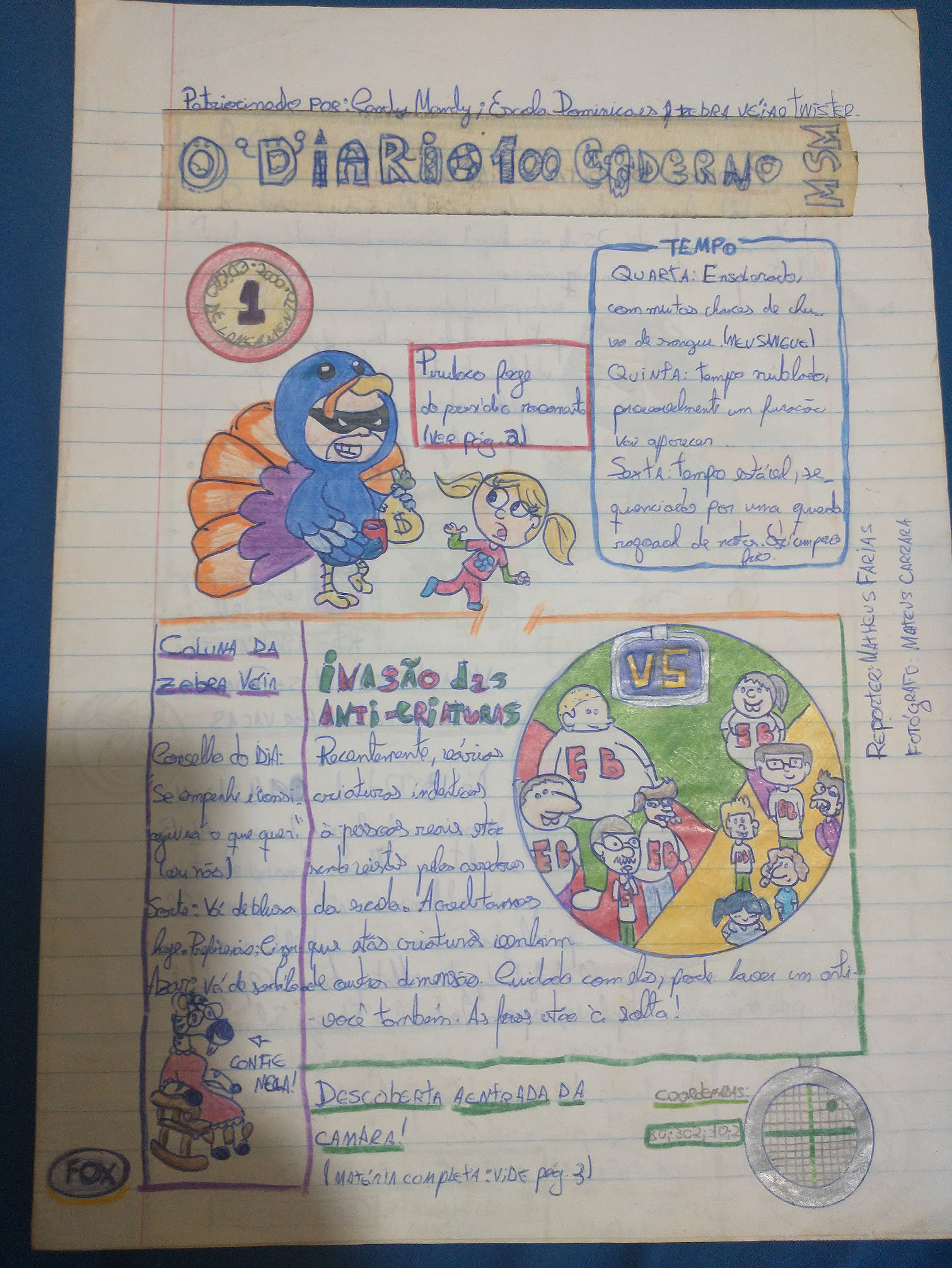 Enfim. O motivo não importa. O fato é que comecei a juntar muito papel almaço sobressalente na minha mochila. E, em um dado momento, no final do terceiro bimestre, quando a gente já tinha passado de ano graças às notas, eu e meu colega Mateus, meu xará, começamos a usar papel almaço extra pra fazer um jornalzinho pra matar o tempo. Assim nasceu o "O Diário 100 Caderno Msm" (na minha cabeça infantil, esse trocadilho era o ápice da genialidade humorística, por brincar com o conceito de caderno jornalístico e caderno escolar).